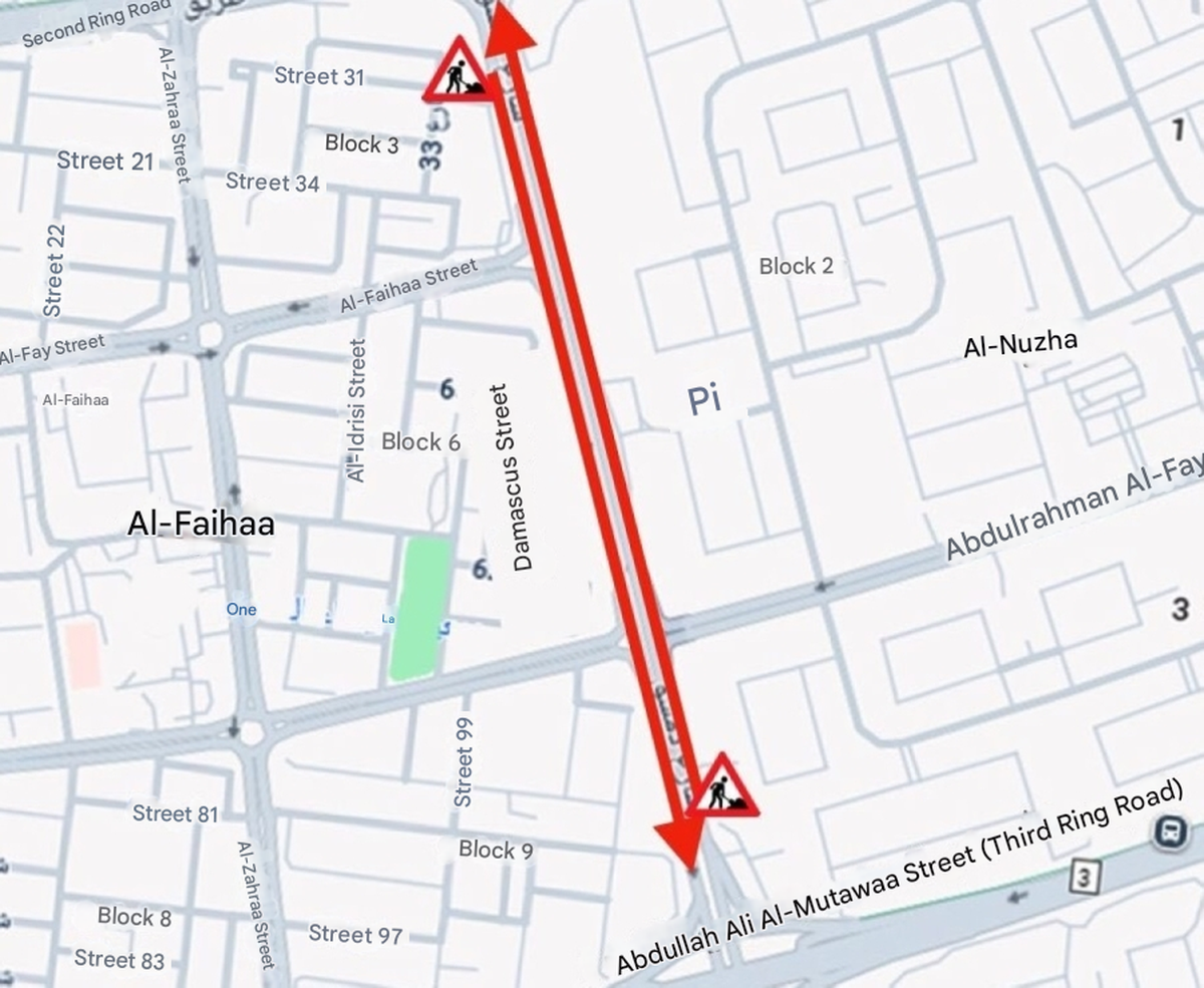 جنرل ٹریفک ڈپارٹمنٹ نے اعلان کیا ہے کہ دمشق اسٹریٹ پر ایکسپریس وے اور مرکزی لینیں دونوں سمتوں میں بند کر دی جائیں گی۔ یہ بندش سیکنڈ رنگ روڈ کے چوراہے سے لے کر تھرڈ رنگ روڈ کے چوراہے تک ہوگی۔